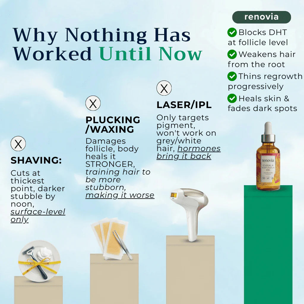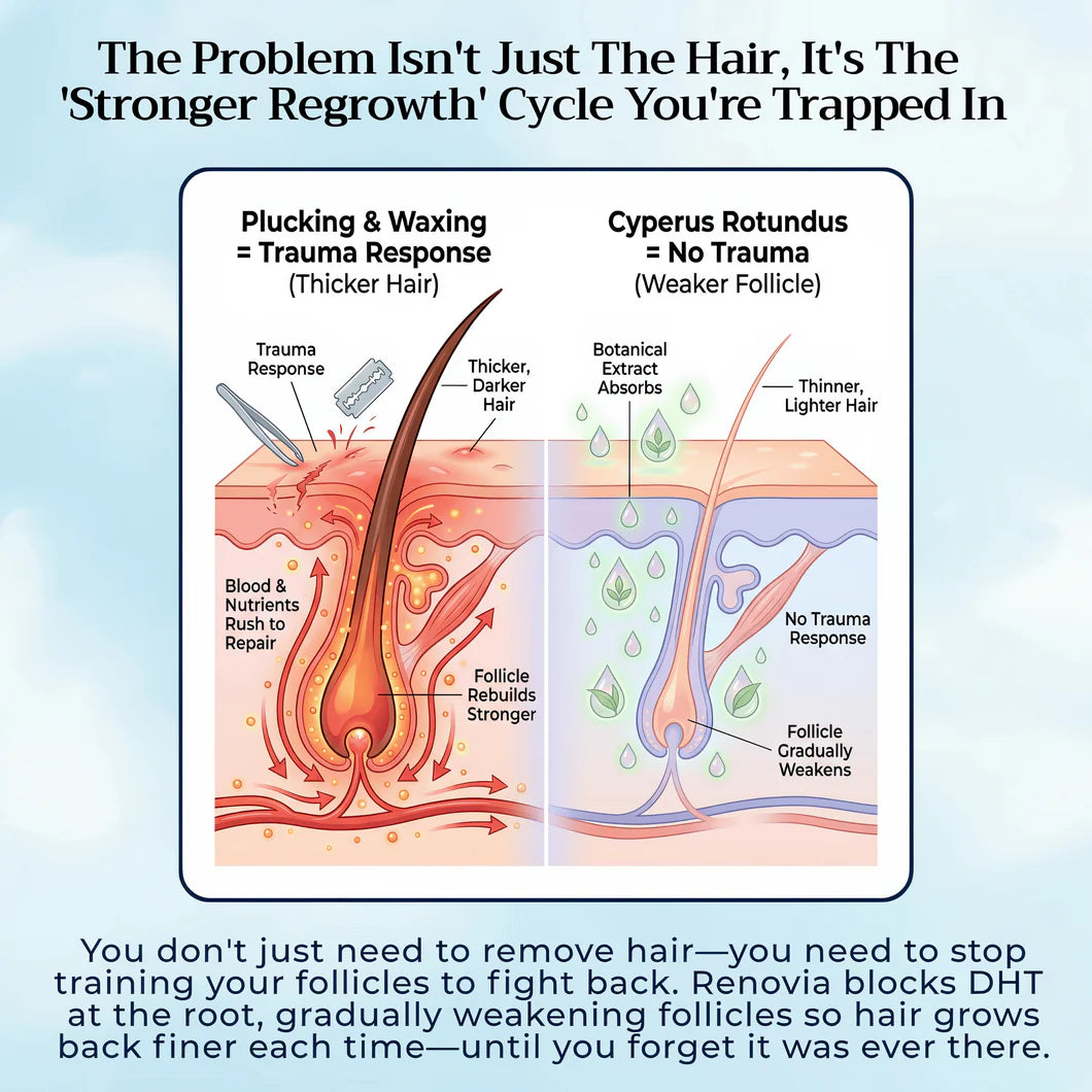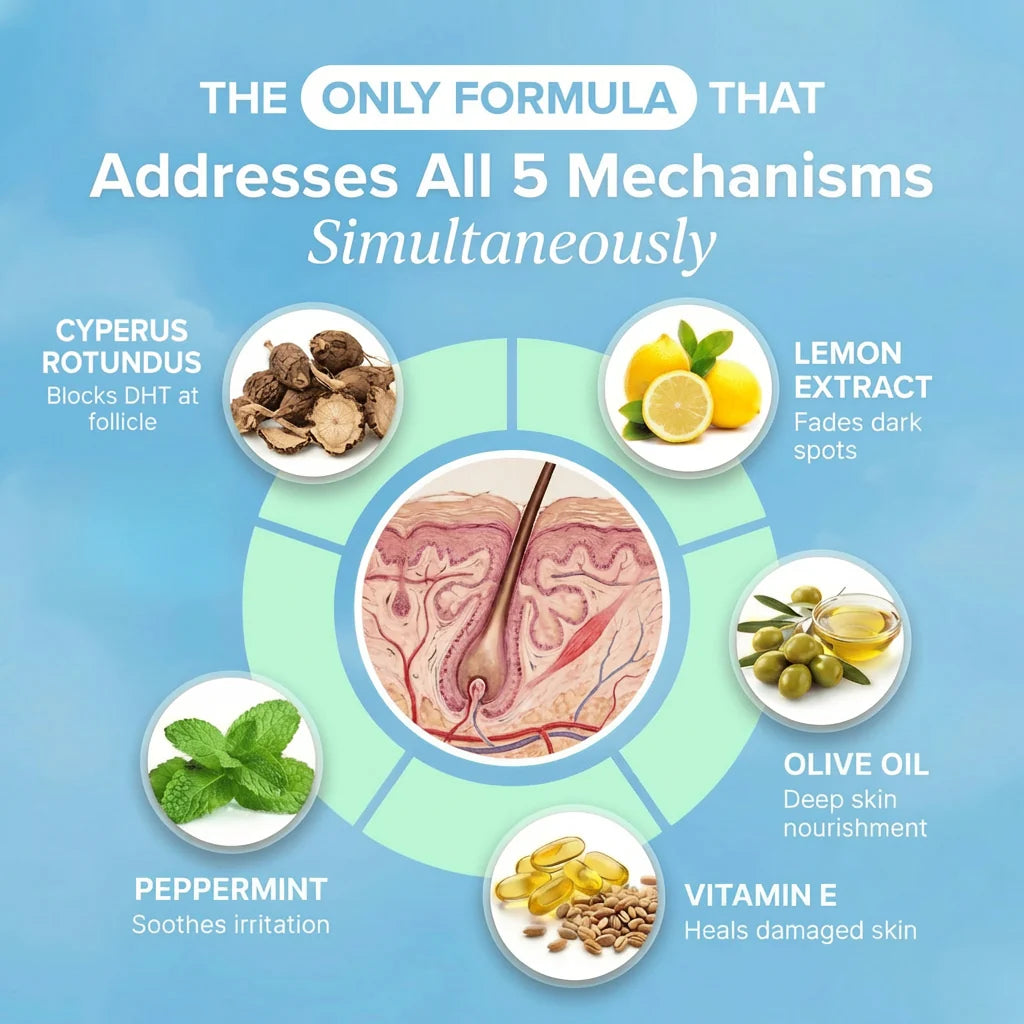 Most products remove surface hair. works at the follicle to calm the enzyme triggering regrowth.